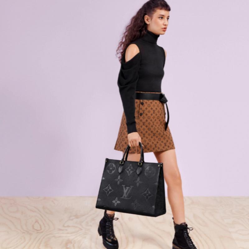 Onthego 手袋以 Monogram Empreinte Giant 压纹软牛皮呈现经典方形轮廓,其充裕空间可收纳办公文件和笔记本电脑。手提或利用长肩带肩背,可在通勤与休闲状态间切换自如。