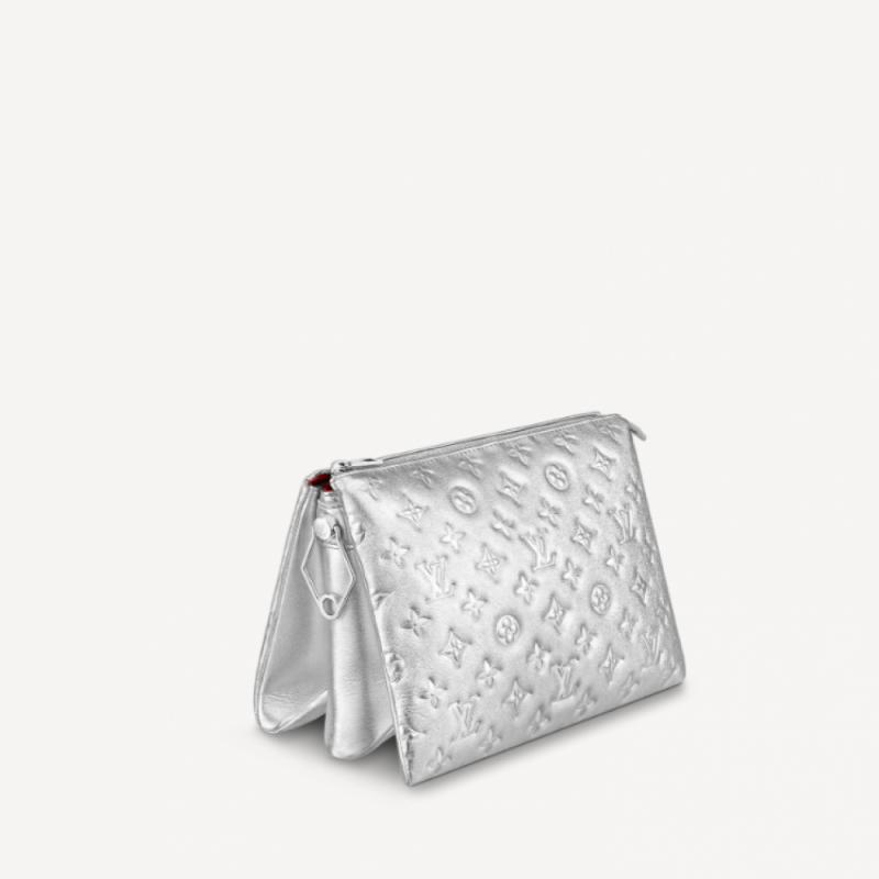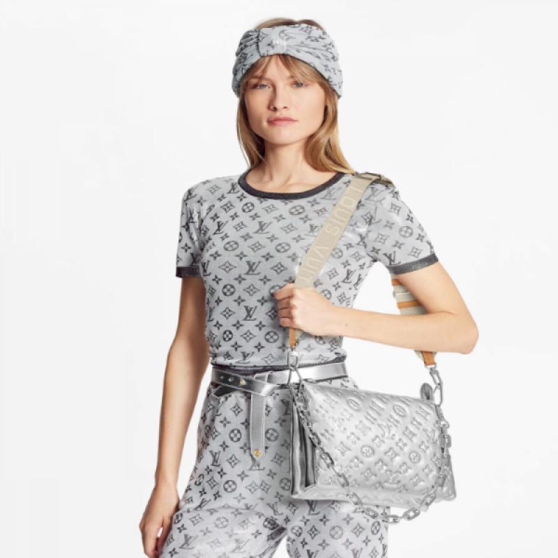 Coussin 小号手袋于 2021 春夏时装秀大放异彩。Monogram 压纹蓬松绵羊皮打造靠枕构型,为简约设计注入前卫风范。可利用肩带斜挎或化身链条法棍包,亦可于腋下携带。