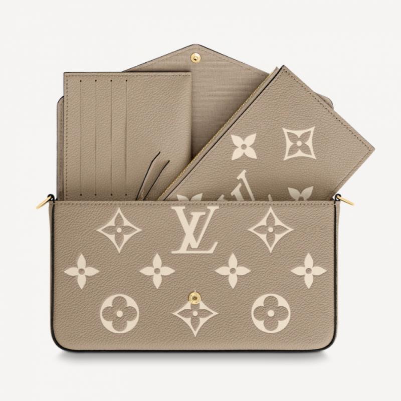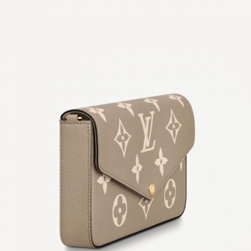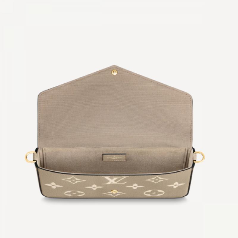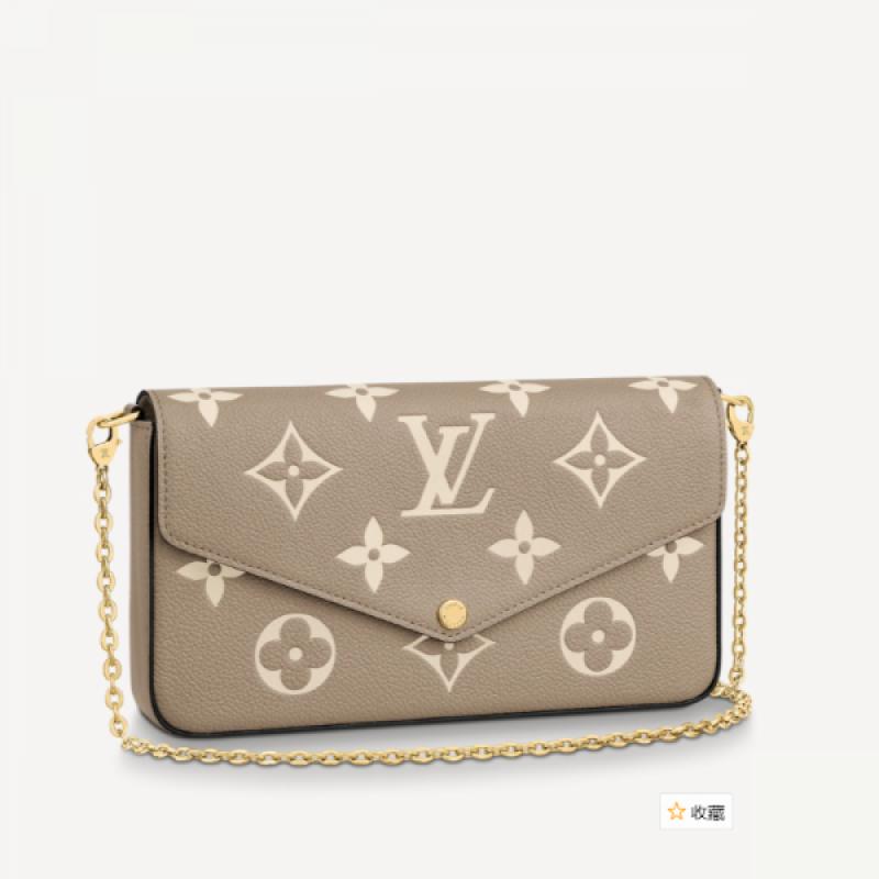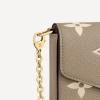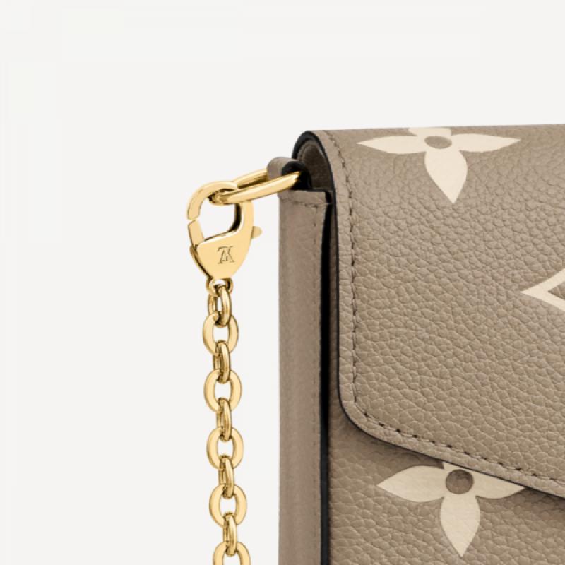 本款 Pochette Félicie 链条包为 Monogram Empreinte 皮革描绘 Monogram 印花,其信封式构型包含可拆卸内袋。系上链条即可完成手拿包和肩背包的随心转换。