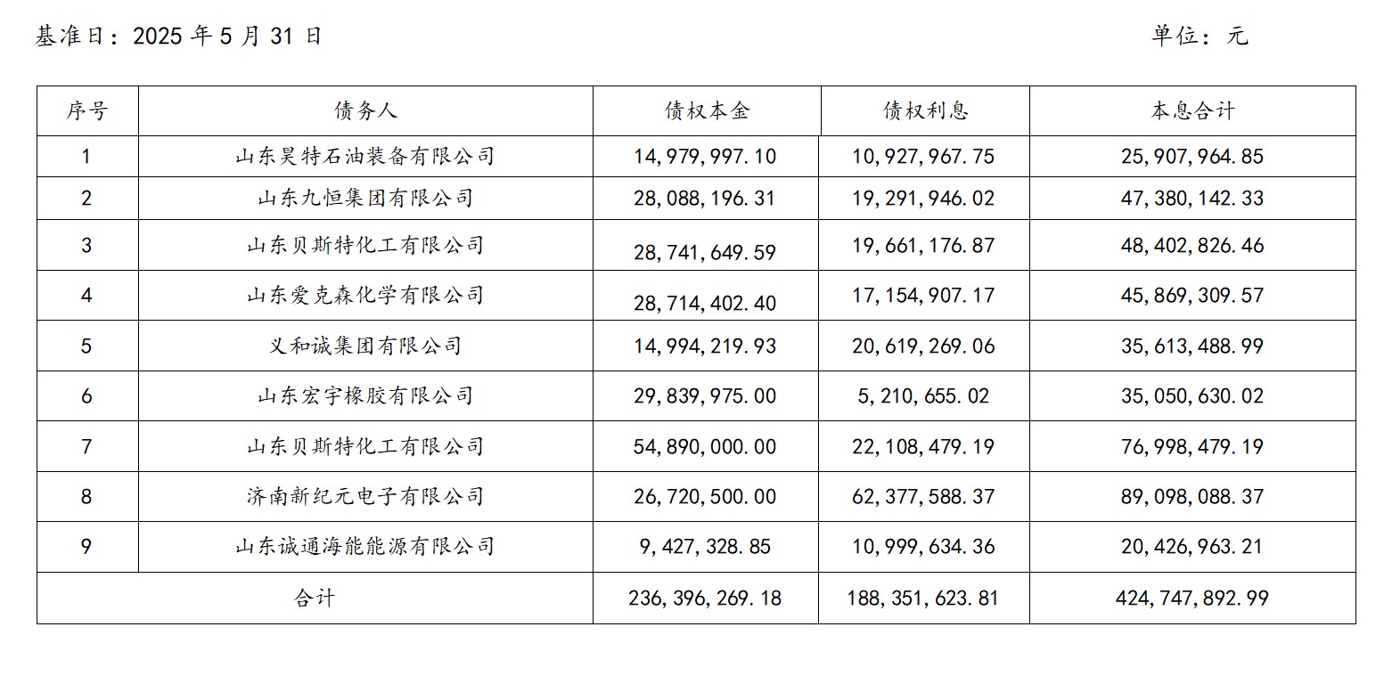 山东昊特石油装备有限公司等9户债权资产,截至基准日2025年5月31日,债权本金236396269.18元,利息188351623.81元,债权合计424747892.99元。