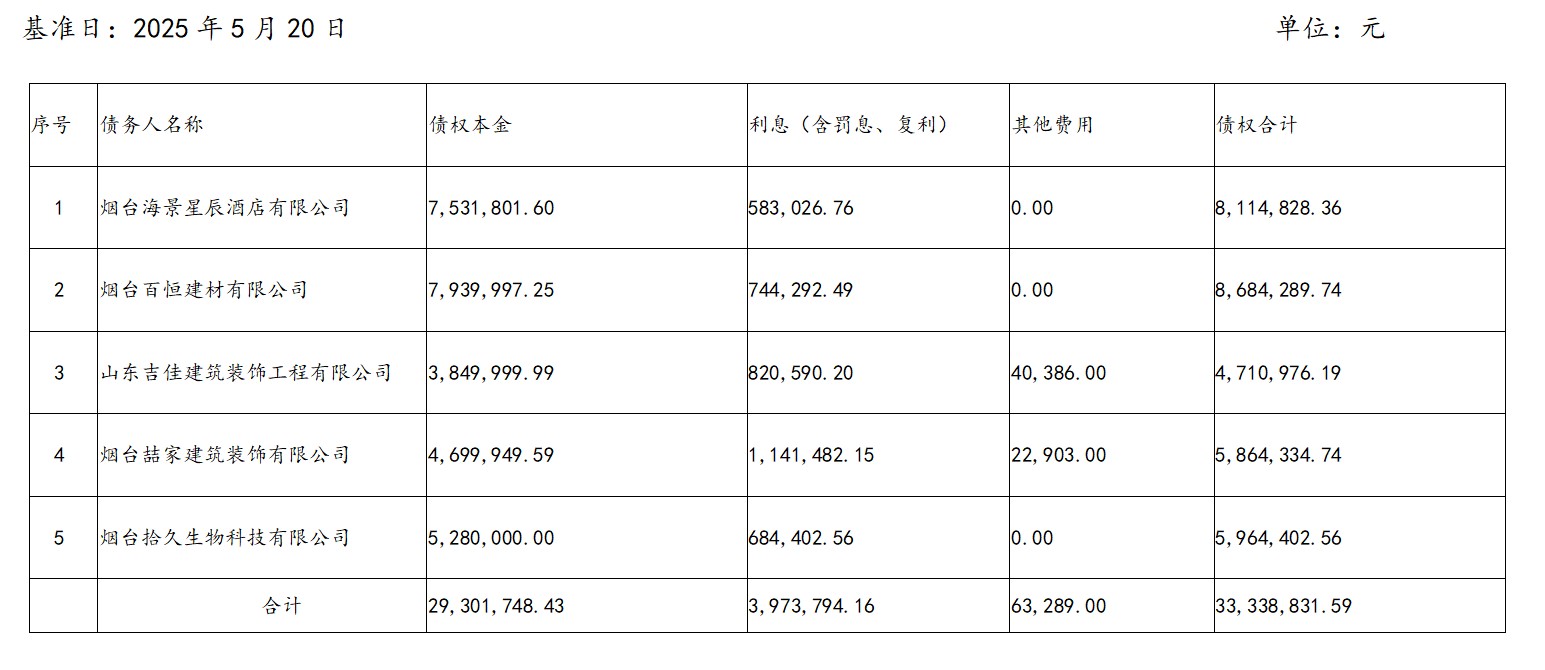 烟台海景星辰酒店有限公司等5户债权资产,截至基准日2025年5月20日,债权本金29301748.43元,利息3973794.16元,其他费用63289.00,债权合计33338831.59元。