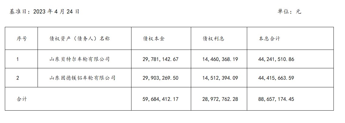 山东固德镁铝车轮有限公司等2户债权资产,截至基准日2023年4月24日,债权本金59684412.17元,利息 28972762.28元,债权合计88657174.45元。