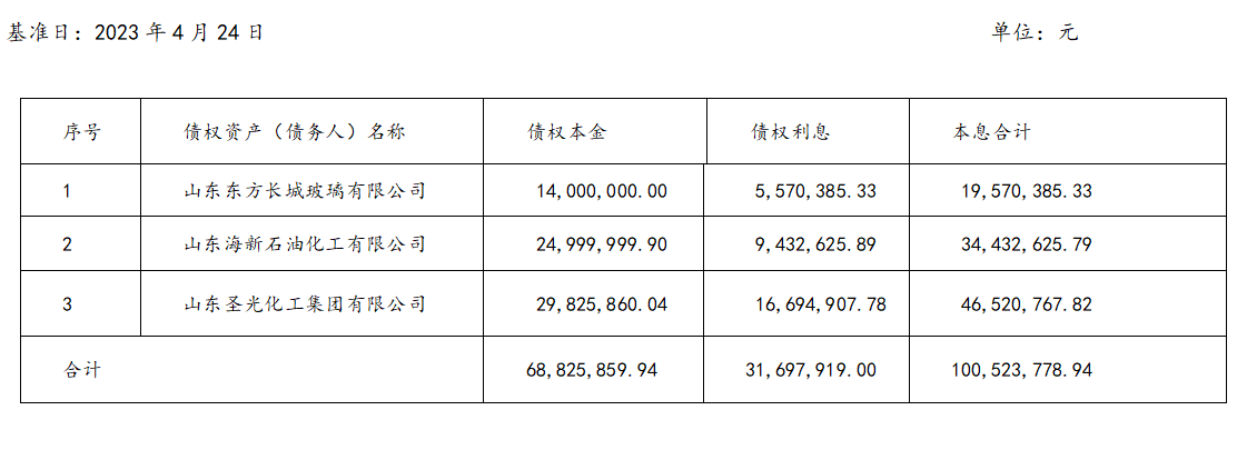 山东圣光化工集团有限公司等3户债权资产,截至基准日2023年4月24日,债权本金68825859.94元,利息31697919.00元,债权合计100523778.94元。