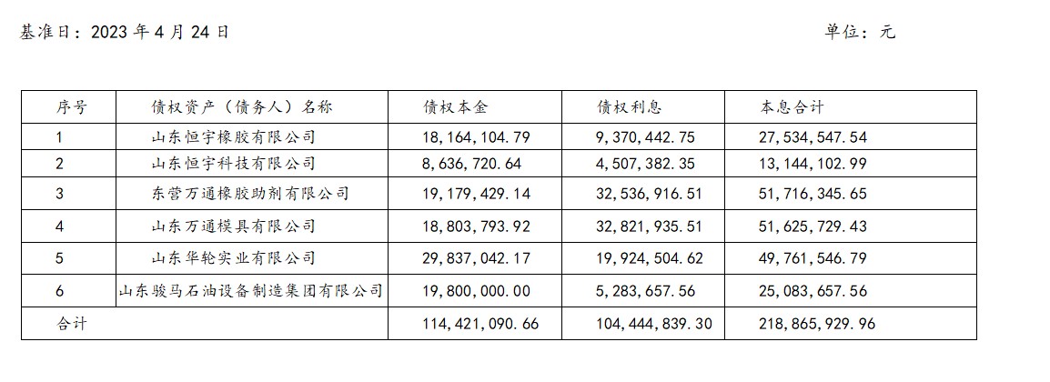 山东万通模具有限公司等6户债权资产,截至基准日2023年4月24日,债权本金本金 114421090.66 元,利息 104444839.30元,债权合计218865929.96 元。