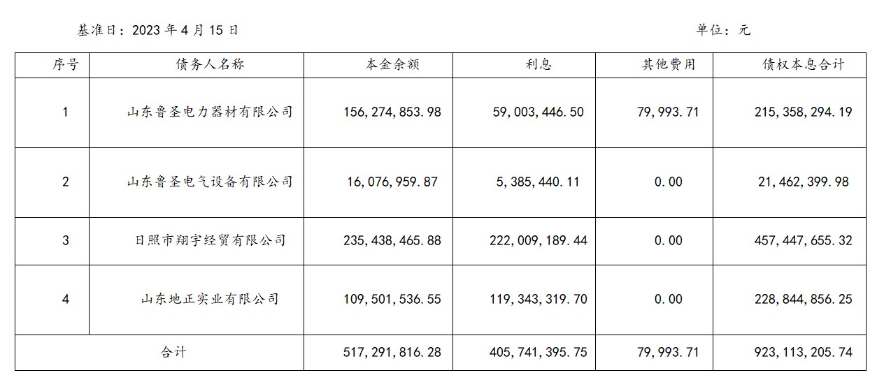 山东鲁圣电力器材有限公司等4户债权资产,截至基准日2025年4月15日,债权本金517291816.28元,利息405741395.75元,其他费用79993.71,债权合计923113205.74元。